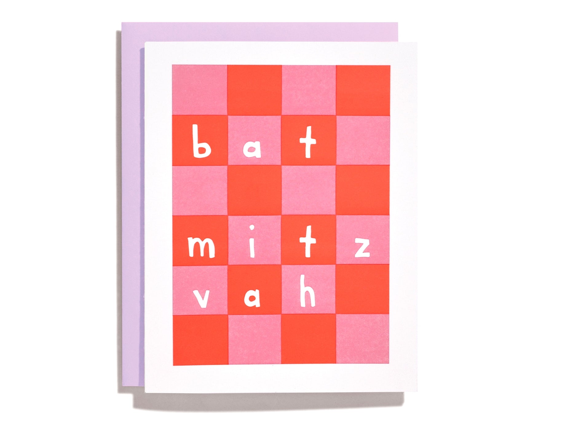 Celebrate this significant milestone with the Bat Mitzvah Greeting Card, adorned with a vibrant checkerboard pattern in striking pink and red hues. Each letter of "bat mitzvah" is elegantly presented in crisp white lowercase, set within its own colorful square for a refined yet playful design. This card offers a tasteful way to convey heartfelt congratulations on a momentous occasion.