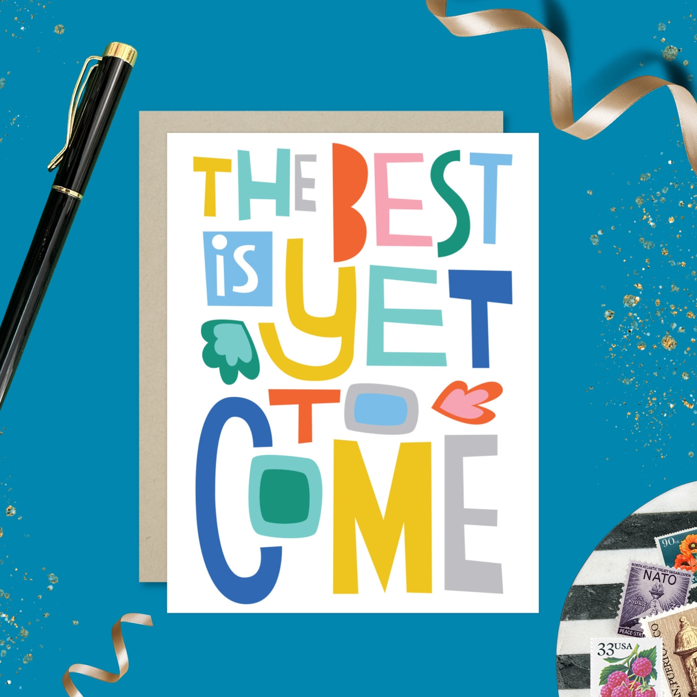 Bold, fun, and full of good vibes! This Best is Yet Birthday Card features funky modern lettering and an uplifting message—perfect for celebrating another year of life. Whether for a friend, family member, or anyone who could use a reminder that the best is yet to come, this unique and stylish design makes every birthday feel extra special. Sustainably printed—because great birthdays (and great cards) should make a positive impact.