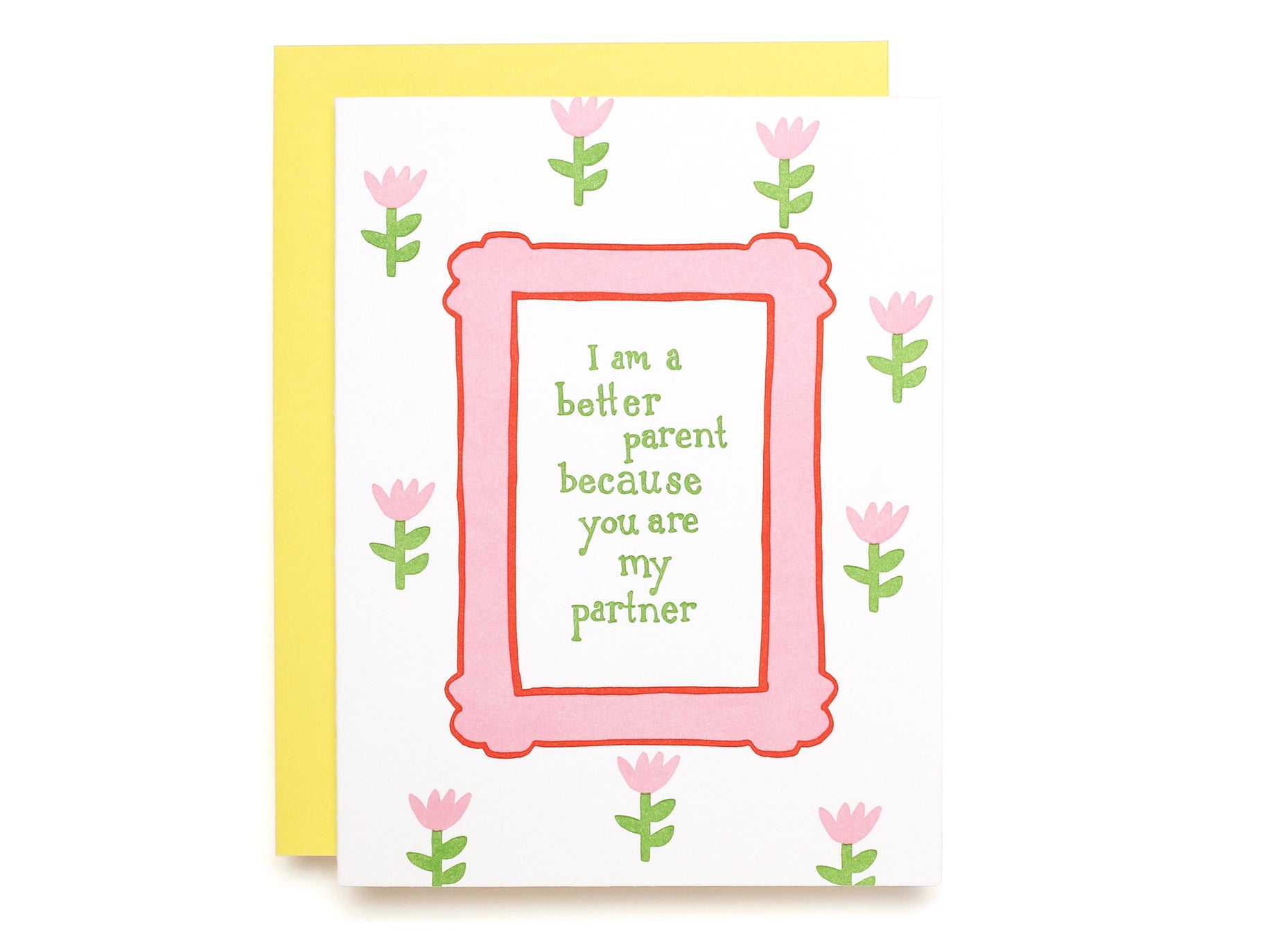 Celebrate your partnership with the Better Parent Greeting Card. Its bold pink frame draws the eye to the heartfelt green message: "I am a better parent because you are my partner." Delicate pale pink flowers and green stems add subtle charm on the white background, while a vibrant yellow envelope completes this striking, unapologetically genuine expression of gratitude.