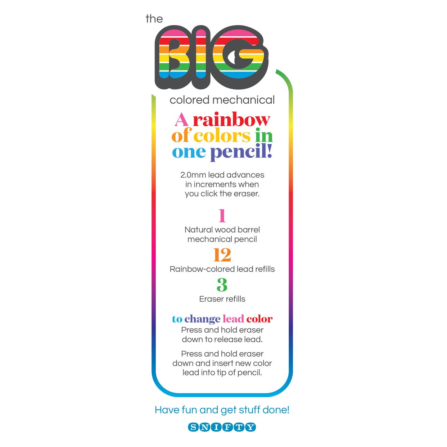 Snifty's Big Colored Mechanical Pencil Set features a chunky wood barrel and brass tip. Beautifully packaged with a set of 12 multicolored replacement leads and 3 erasers.