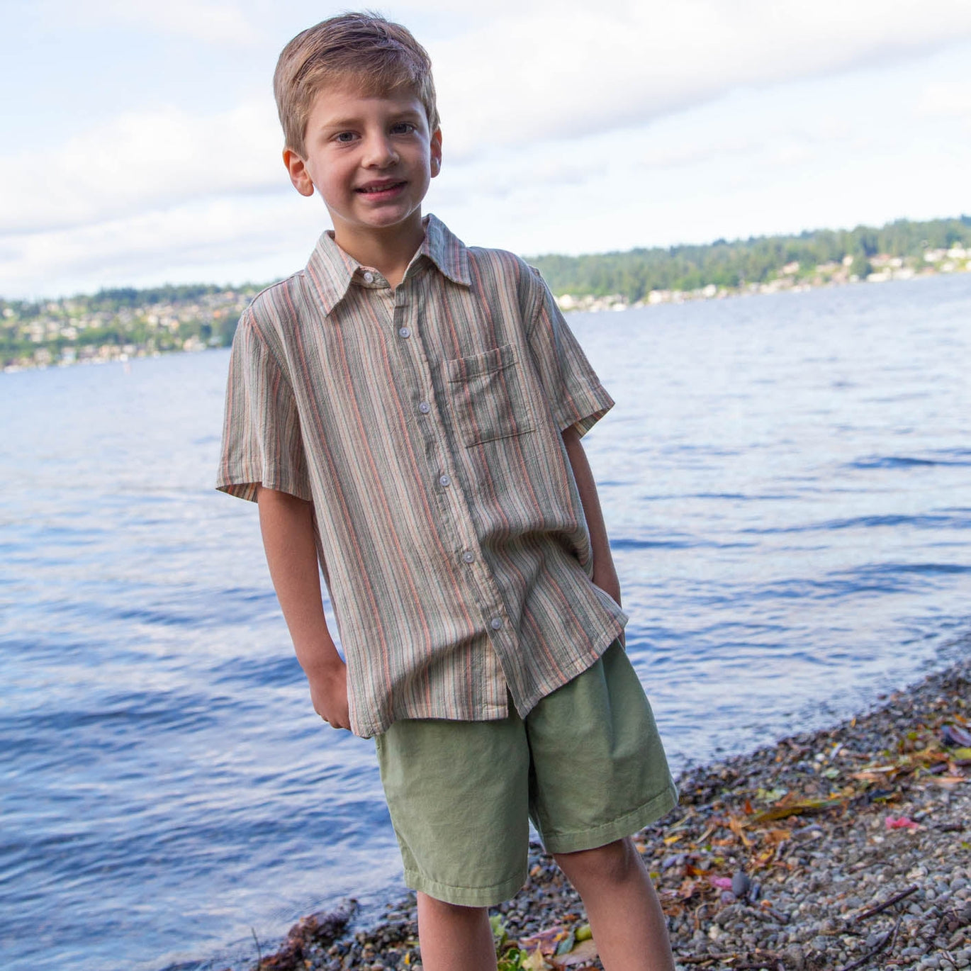 Smart and casual shirt with a lovely green and peach stripe for a pastel-hued look! The little ones will love the cool touch of soft cotton and enjoy the feel of summer in this comfortable Boys Short Sleeves Collar Shirt.