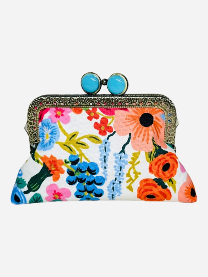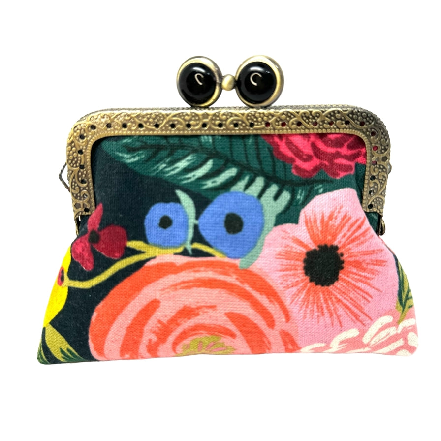 Handmade with high-quality 100% cotton fabric by Rifle Paper Co. and fully lined with coordinating fabric. The purse frame measures 4.14" W x 2.36" H. This gorgeous ancient bronze embossed lace metal frame has a kiss-clasp lock with lotus head semi-circular beads. The finished bag at its widest part measures 5.25" W x 4” H X 1.5” D.