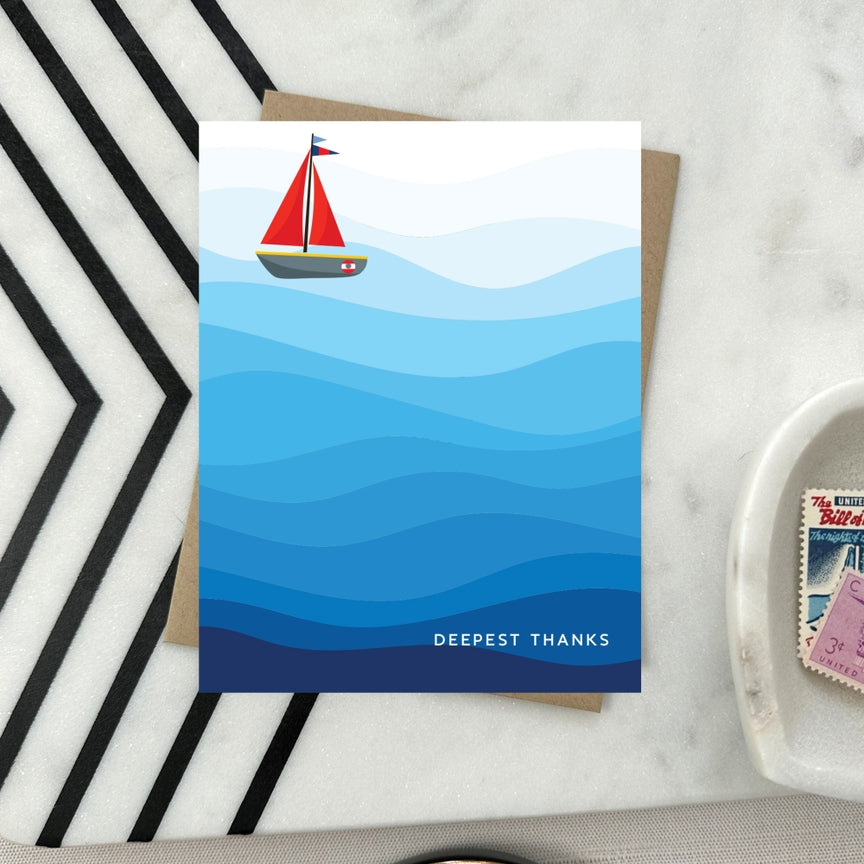 Send oceans of gratitude with this serene and calming Deepest Thanks Card. Featuring a graphic depiction of deepening waters with a sailboat floating above and the heartfelt message “Deepest Thanks,” this card is a meaningful way to express appreciation. Perfect for anyone looking for thank you cards, greeting cards, or modern and minimalist stationery, this design is a beautiful way to show your gratitude.