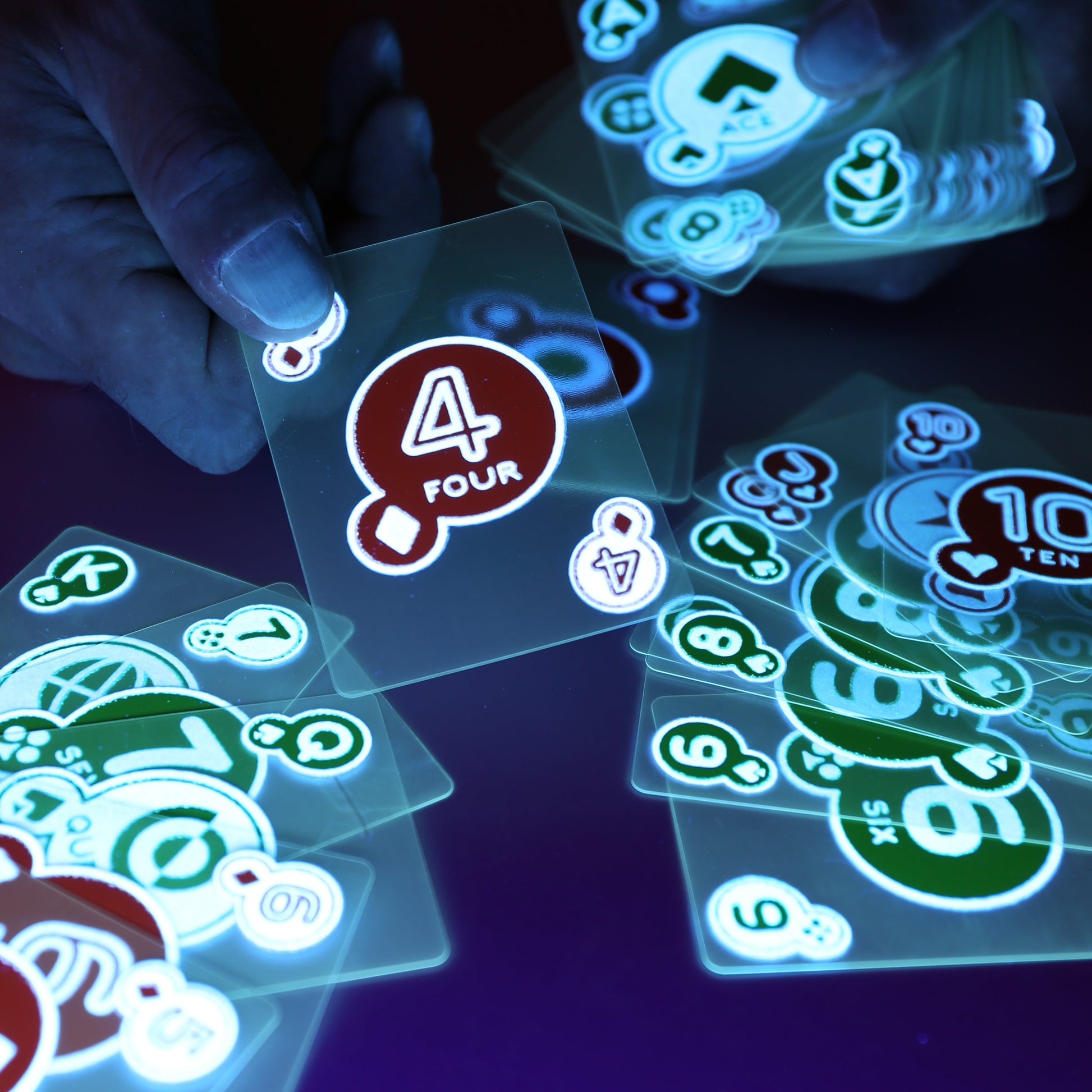 Take these Glow In the Dark Playing Cards to camping with you and play card games well into the night with these poker size glow in the dark playing cards. Fully charged cards give two hours of playing time.
