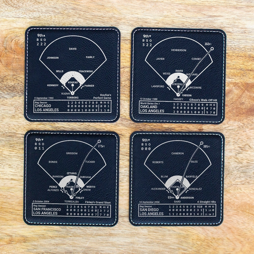 Relive four of the greatest moments in Los Angeles baseball history with the Greatest Dodgers Plays Coasters. Each set comes with four laser-etched coasters depicting these historic plays:
