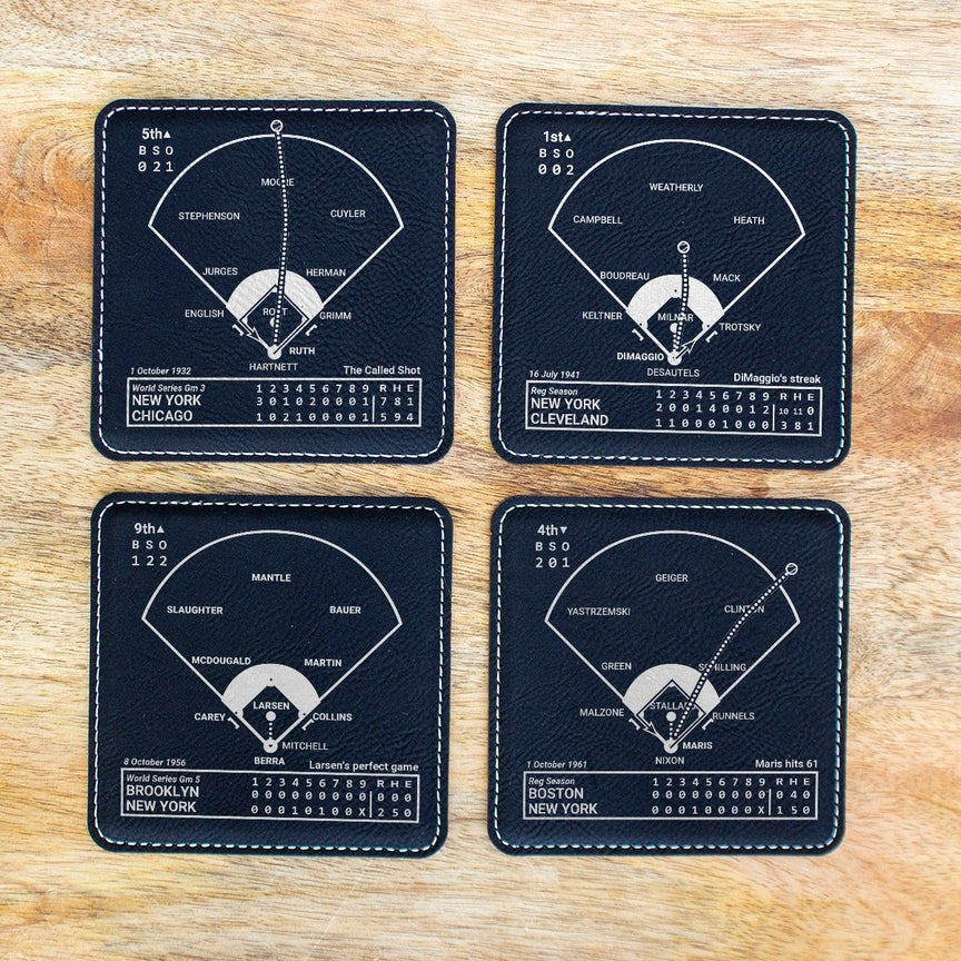 Relive four of the greatest moments in New York baseball history with the Greatest Yankees Vintage Plays Coasters. Each set comes with four laser-etched coasters depicting these historic plays: