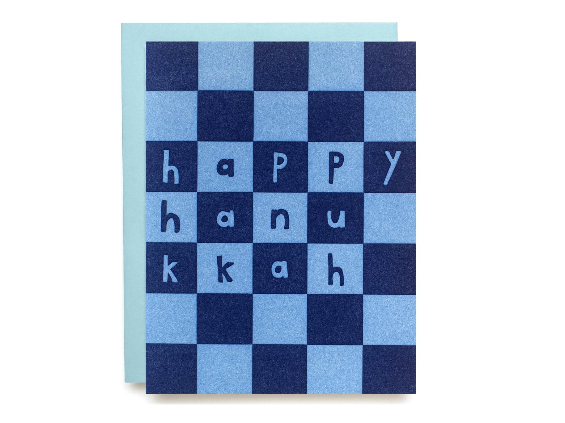 Celebrate Hanukkah with bold style using the Hanukkah Checker Greeting Card Boxed Set. Its vibrant checkerboard pattern in rich blues sets a daring backdrop for the cheerful "happy hanukkah" message displayed in crisp white letters. This card’s modern design makes a striking statement, perfect for sharing festive cheer with confidence and flair.