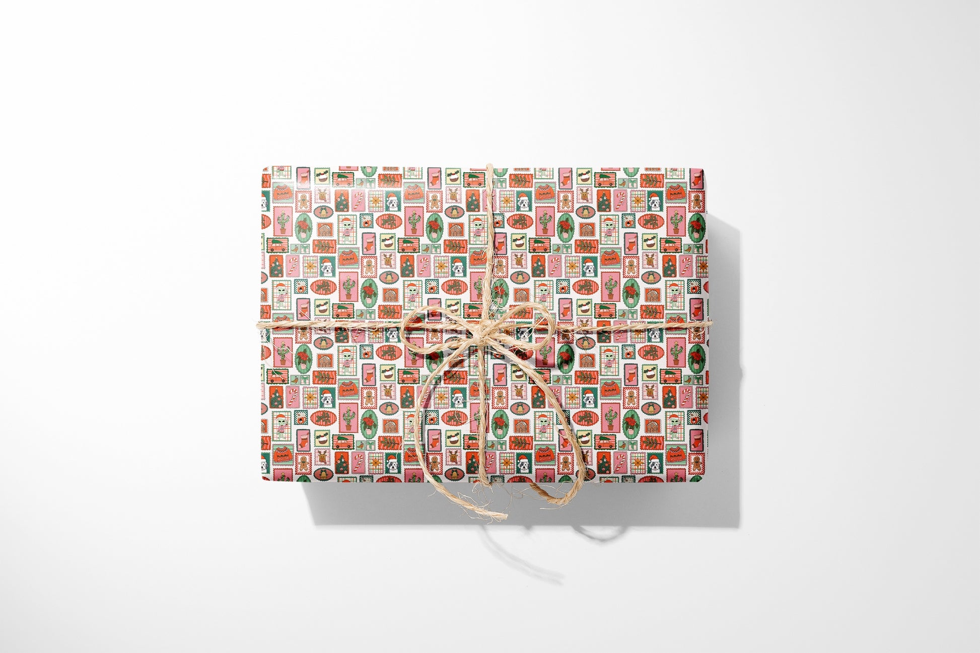 The paper features charming artwork arranged in a playful stamp motif, making it look like each gift is covered in mini holiday postcards. These captivating designs create a sense of nostalgia and festive cheer, turning every wrapped present into a postage of affection and warm wishes.