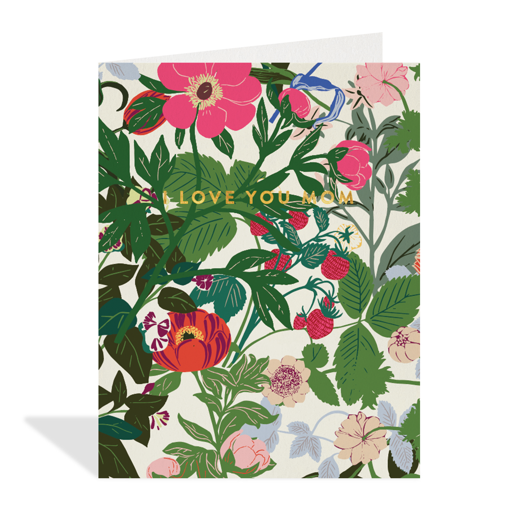 Express your affection with this stunning I Love You Mom Card, showcasing a lush hand-illustrated garden of wildflowers in rich, painterly detail. Artist Hannah Beisang's design is elevated with elegant gold foil accents that catch the light beautifully. Crafted on responsibly sourced paper, this eco-conscious card arrives blank inside, giving you the perfect canvas to pen your most heartfelt sentiments. A gorgeous way to show mom she's cherished.