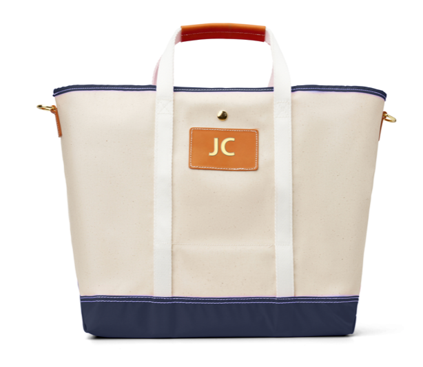 A coated canvas tote just big enough to take everywhere. Features a detachable shoulder strap, leather wrapped handles, and a strap to slide over luggage handles. Prices include personalization.
