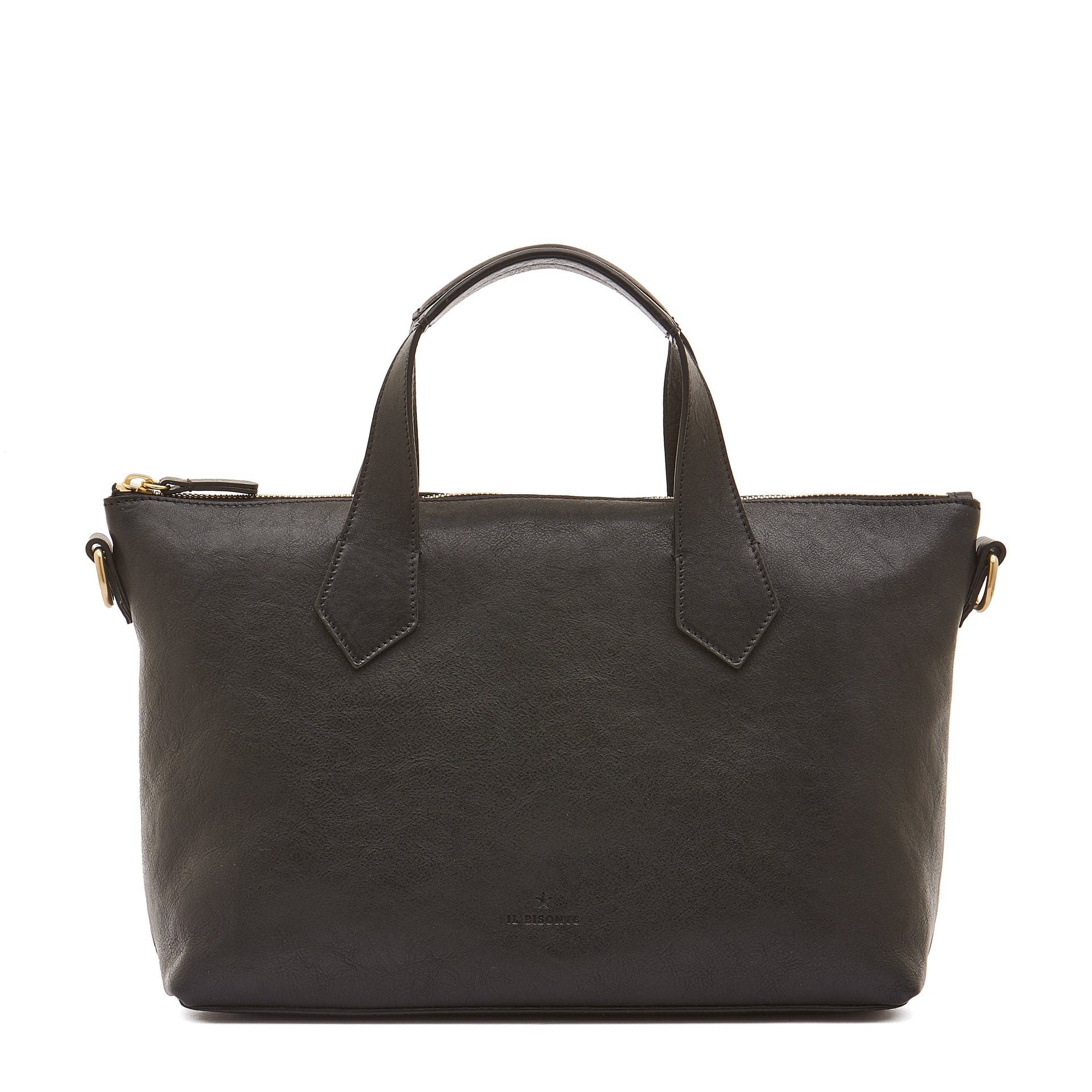 Le Laudi Handbag in vintage vegetable-tanned leather, also wearable on the shoulder. Adjustable and removable shoulder strap with brass studs. Zip closure with leather zipper pull. Reinforced handles ensure comfort. The suede-lined interior features a small open leather pocket.100% made in Italy.