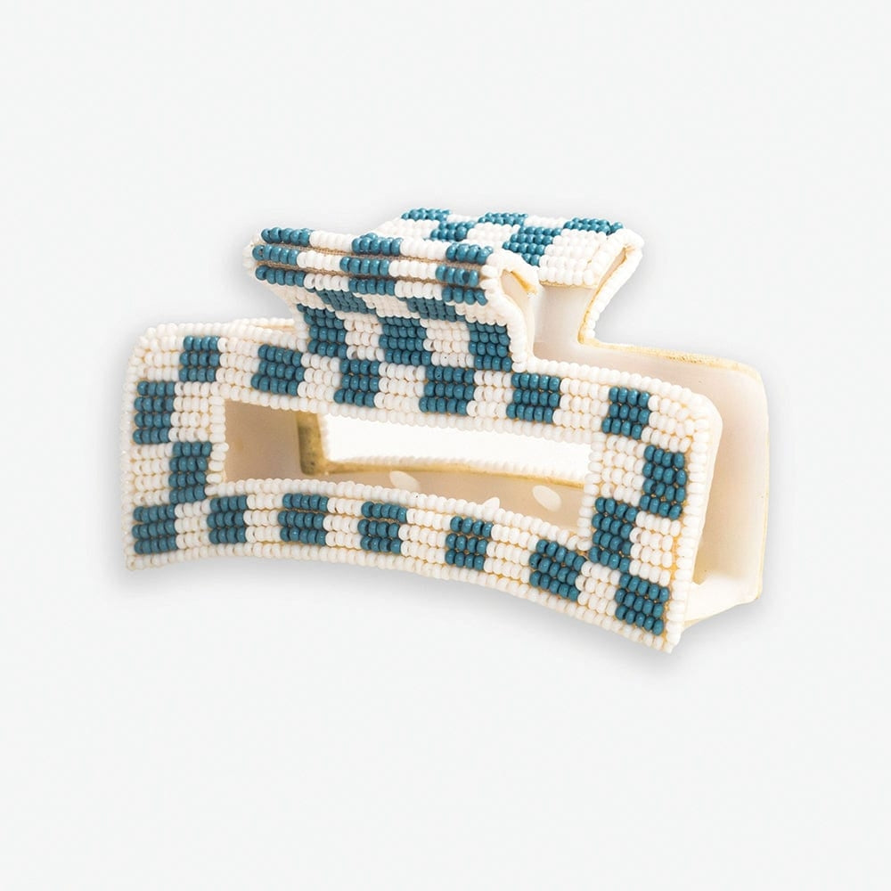 Whether you're cheering courtside or meeting friends post-game, the Lola Checked Beaded Claw Clip is a stylish way to support your squad. Handcrafted with intricate beadwork, this distinctive hair piece elevates your game day ensembles with a touch of free-spirited flair.