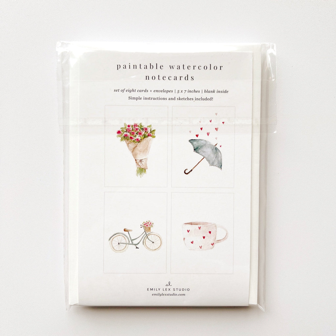 Paint your own special cards to send to loved ones with the Love Sweet Love Paintable Notecards! Sketches are printed on the front of each card with simple instructions for you to paint in with watercolors. You'll receive eight cards with two of each illustration: umbrella, bouquet, bicycle, mug. Perfect for artists of all ages!