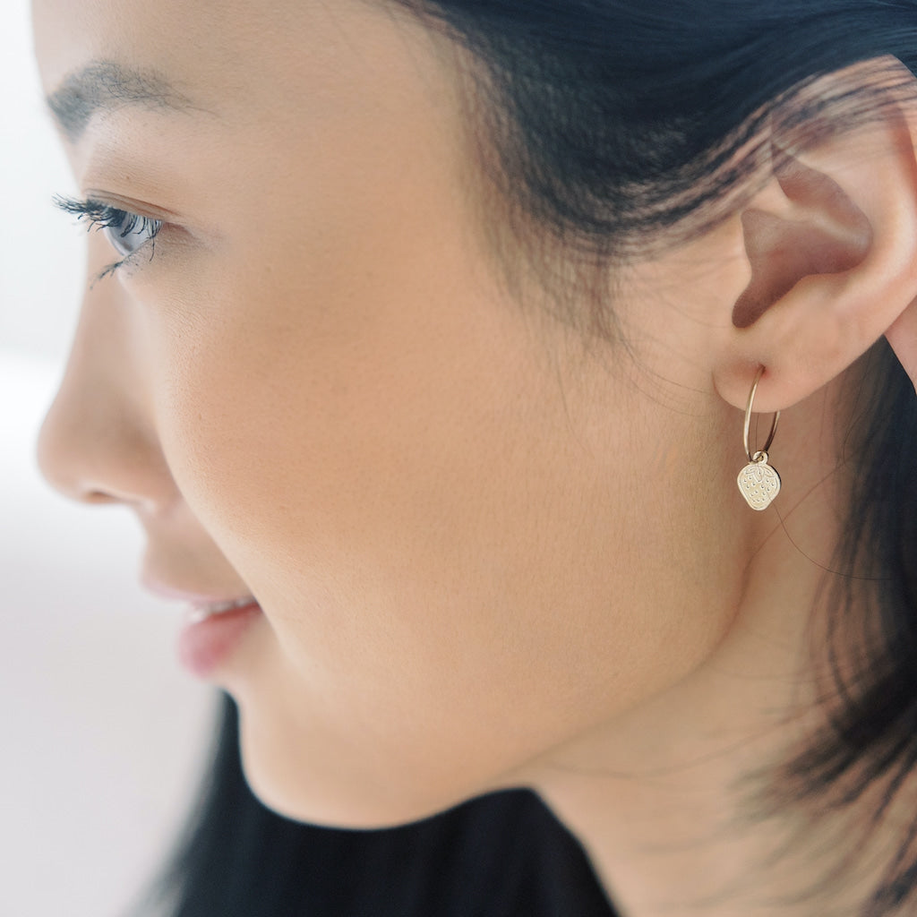 Delicate hoop earrings featuring miniature strawberry charm accents that bring a playful sophistication to any look. The skinny silhouette works beautifully as a standalone statement or layered with complementary pieces for a curated ear aesthetic. The Magic Charm Strawberry Hoops are perfect for those seeking understated elegance with a whimsical touch.