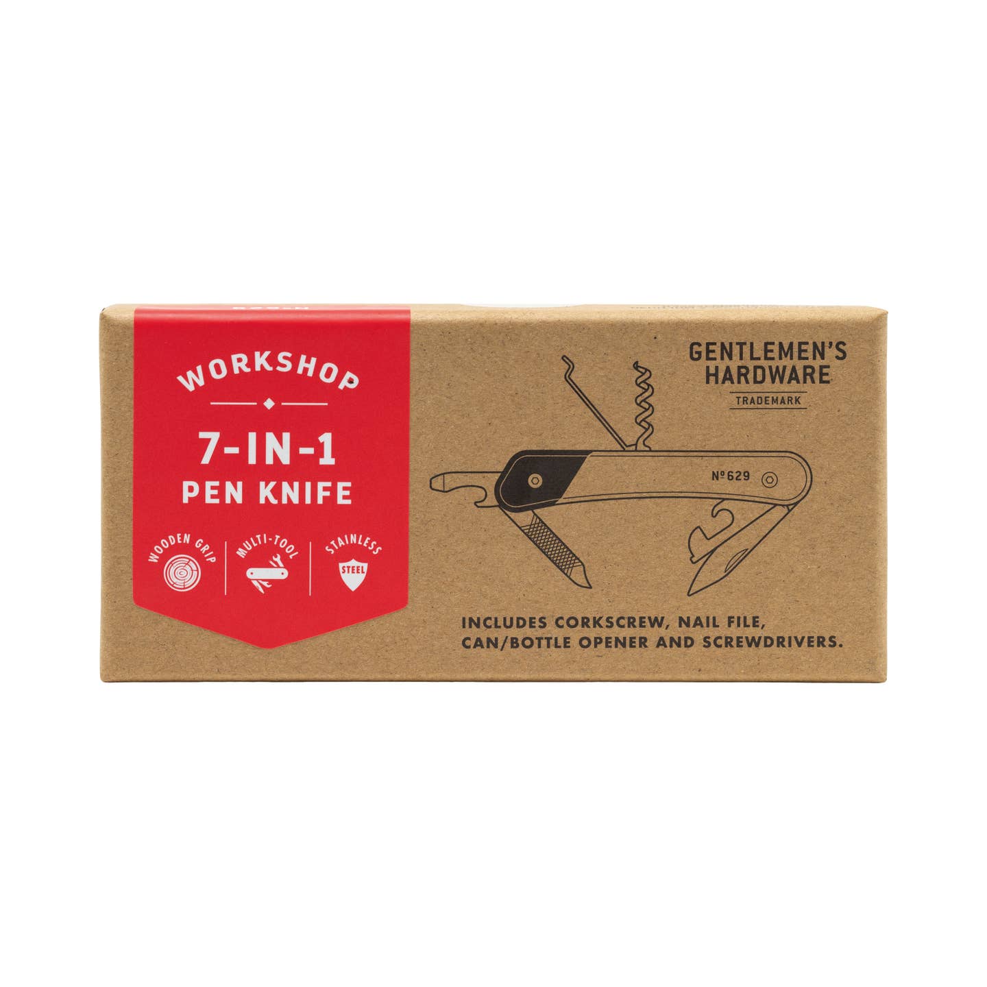 Carry versatility in your pocket with this 7-in-1 Pen Knife Multi Tool. The elegant wooden handle houses seven essential stainless steel tools including a corkscrew, can/bottle opener, 3mm and 5mm flat head screwdrivers, and a nail file. With its sleek titanium finish, this compact multi-tool is both practical and stylish. Comes packaged in a gift box, making it perfect for the handy person in your life.