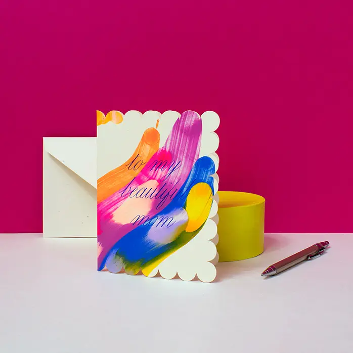 The Plumeria Mom Card is hand-painted on large pieces of card stock before foil stamping on one of Moglea's antique foil presses. The result is a completely one-of-a-kind card. This card uses Moglea's swirl paint process and includes a signature Moglea embossed envelope.