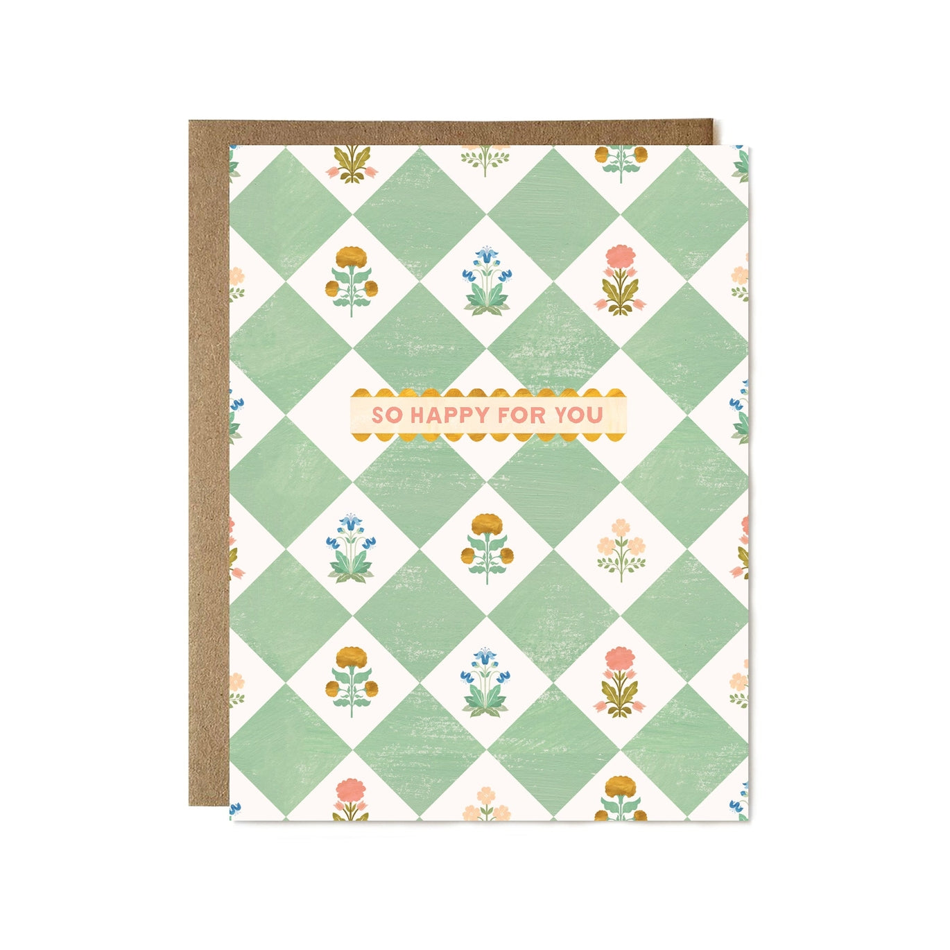 Share your excitement with the So Happy For You Card, designed to celebrate joyful moments in style. Featuring a charming sage green and white checkered pattern, accented with folk-inspired florals in golden yellow, soft pink, and gentle blue, this card radiates cheerful elegance. The vibrant golden banner perfectly captures your heartfelt congratulations.