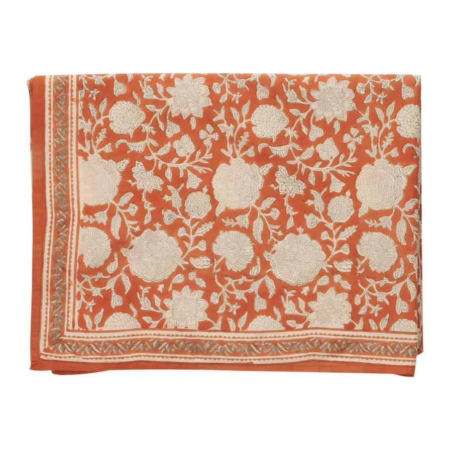 The Tupia Terracotta Tablecloth was designed by Bonheur du Juor's designer team, and then hand-printed by artisans in Jaipur using the hand-carved wooden stamp technique...